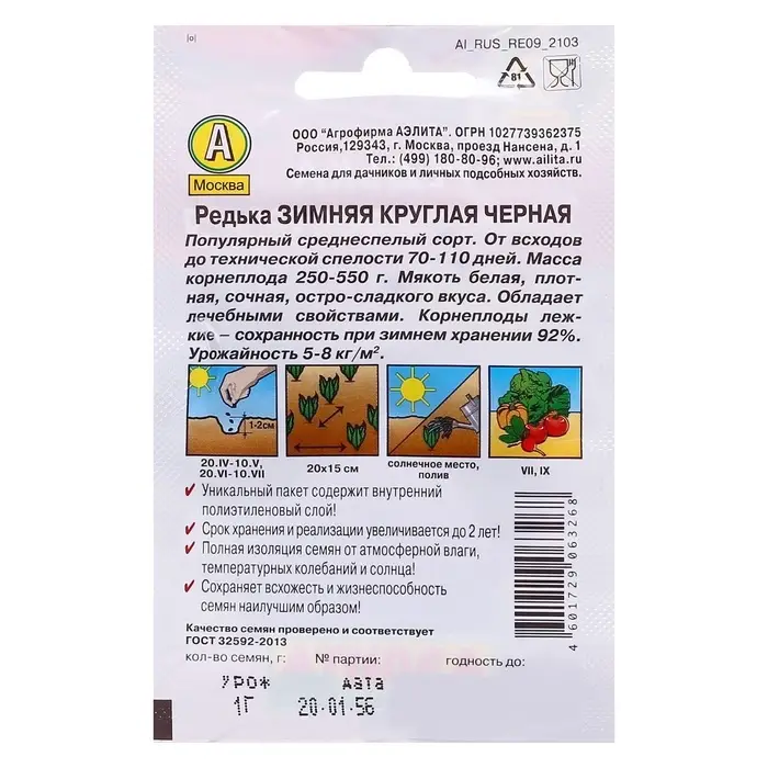 Семена Редька "Зимняя круглая черная", цв/п, 1 г