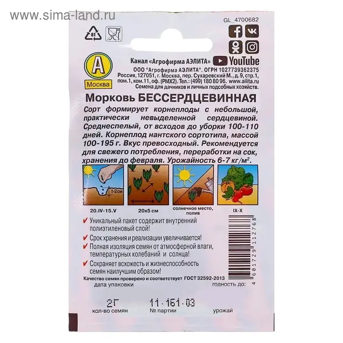 Сорт формирует корнеплоды с небольшой, практически невыделенной сердцевиной. Среднеспелый, от всходов до уборки 100-110 дней. Корнеплод нантского сортотипа, массой 100-195 г. Вкус превосходный. Рекомендуется для свежего потребления, переработки на сок, хранения до февраля. Урожайность 6-7 кг/м2.