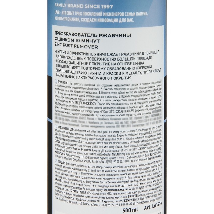 Преобразователь ржавчины LAVR с цинком, 500 мл, триггер, Ln1436