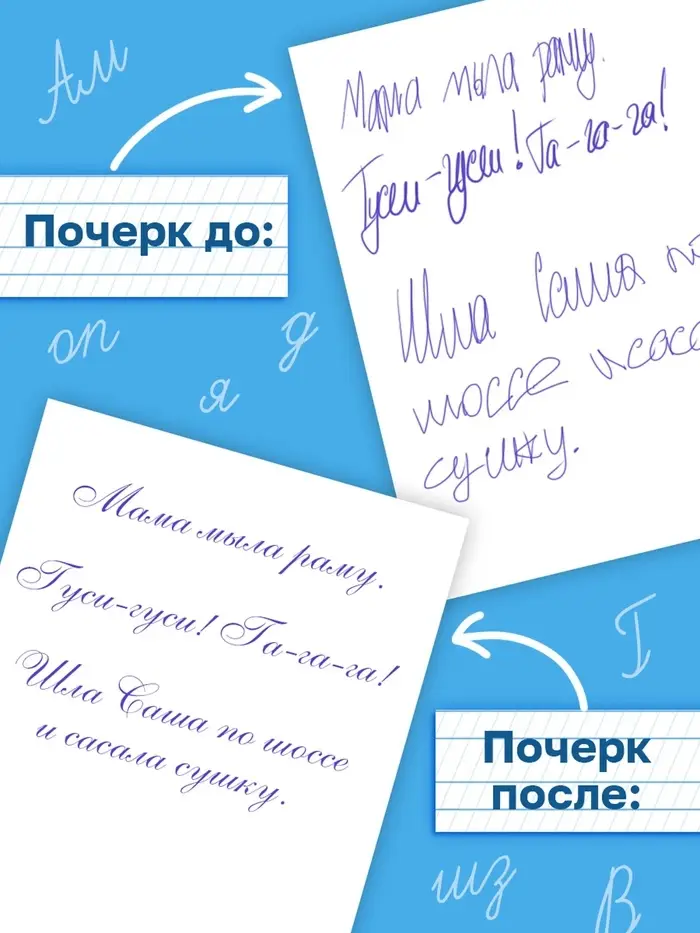 - 36 страниц с каллиграфическими упражнениями, включая линейки разных типов: косую, узкую и без линовки.