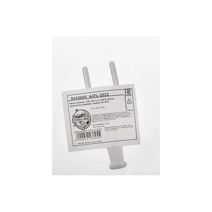 Вилка прямая, 10А, без з/к, 220 В, белая, розничная упаковка