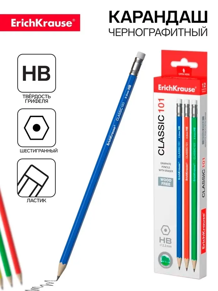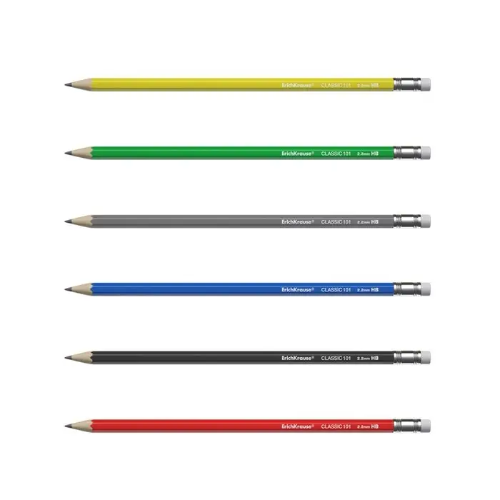Карандаш чернографитный с ластиком ErichKrause "Classic 101", HB, грифель d=2.2 мм, пластик, шестигранный в коробке, микс