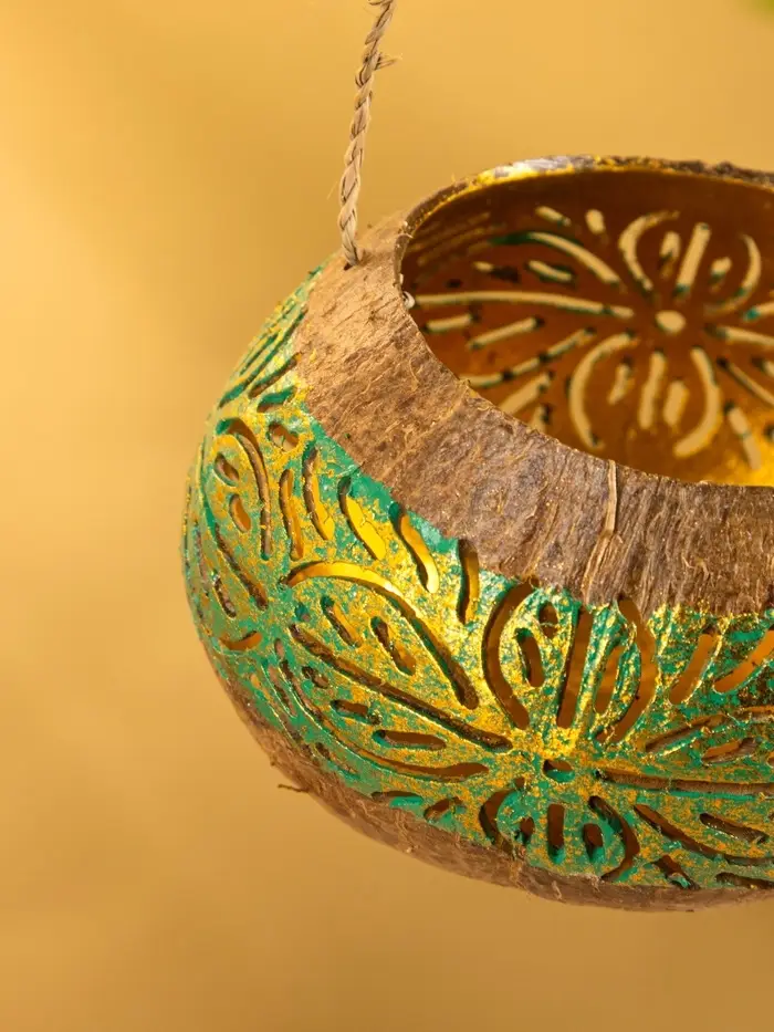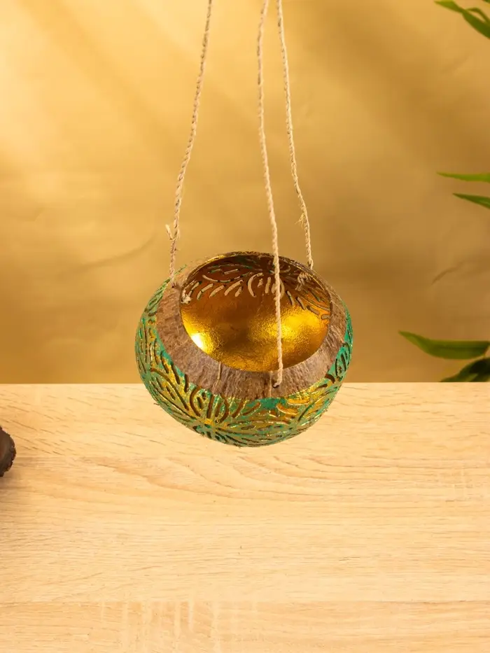 Подсвечник подвесной из кокоса, 9-12 см, зелёно-золотой