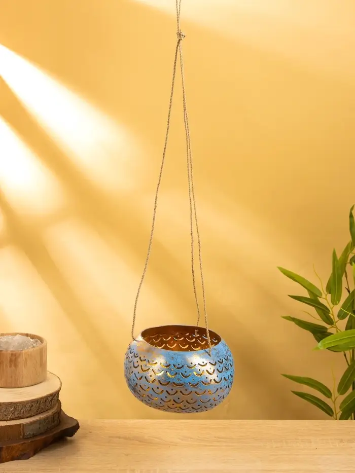 Подсвечник подвесной из кокоса, 14-16 см, сине-золотой