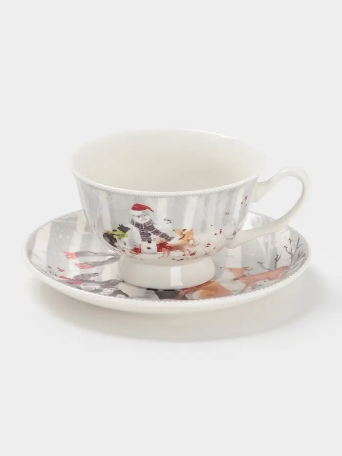 Чайная пара новогодняя «Снежные забавы», 2 предмета: чашка 180 мл, блюдце d=15 см, керамика, подарочная упаковка, белая