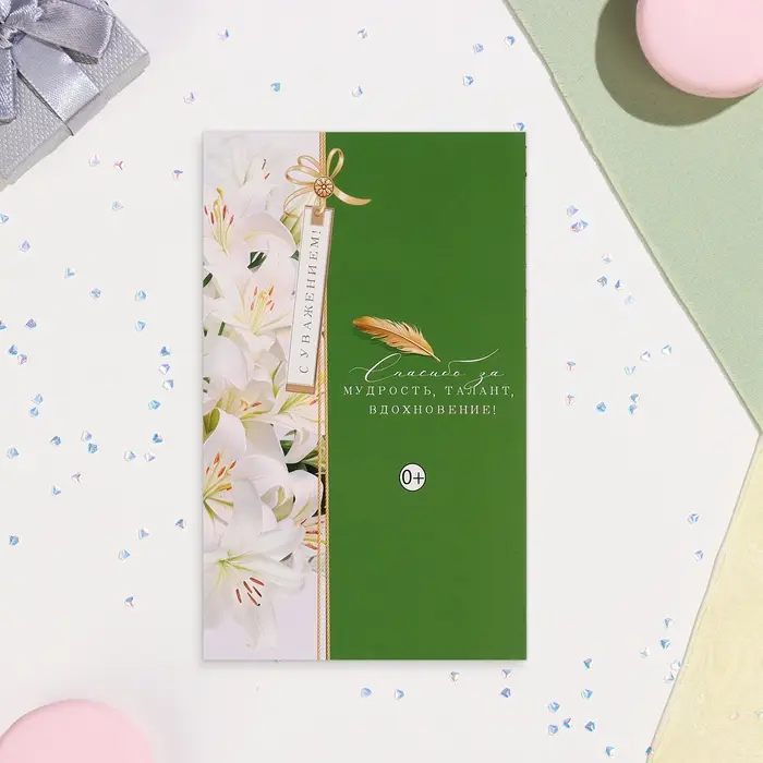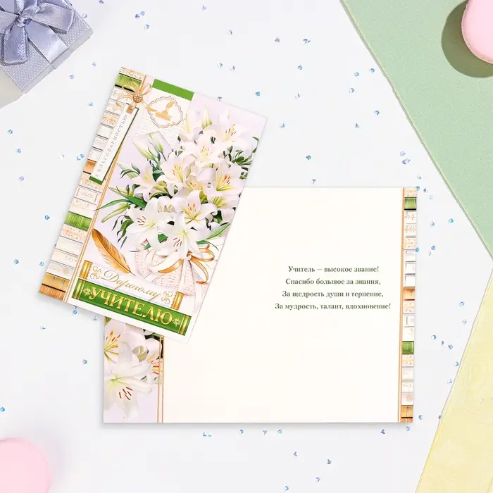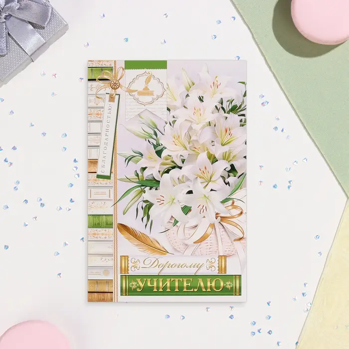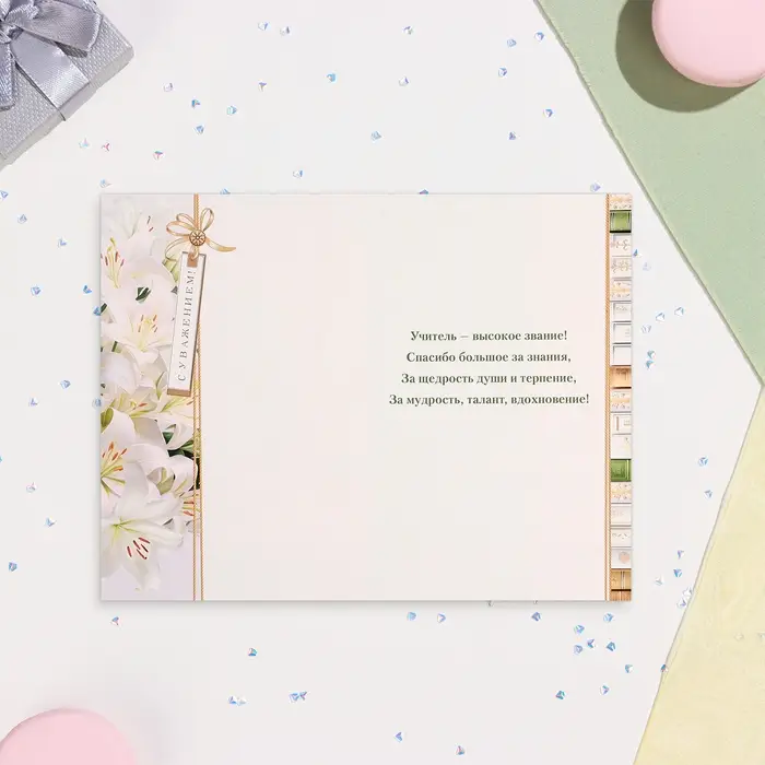 Открытка "Дорогому учителю!" белые лилии, 12,5х19,5 см