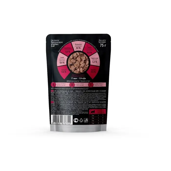 Гарантируемые показатели (на 100 г продукта) *: влажность – 83 %, сырой протеин – 6,0 %, сырой жир – 3,0 %, кальций – 0,5 %, фосфор – 0,3 %, энергетическая ценность – 65 ккал/274 кДж.