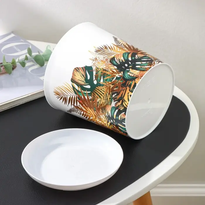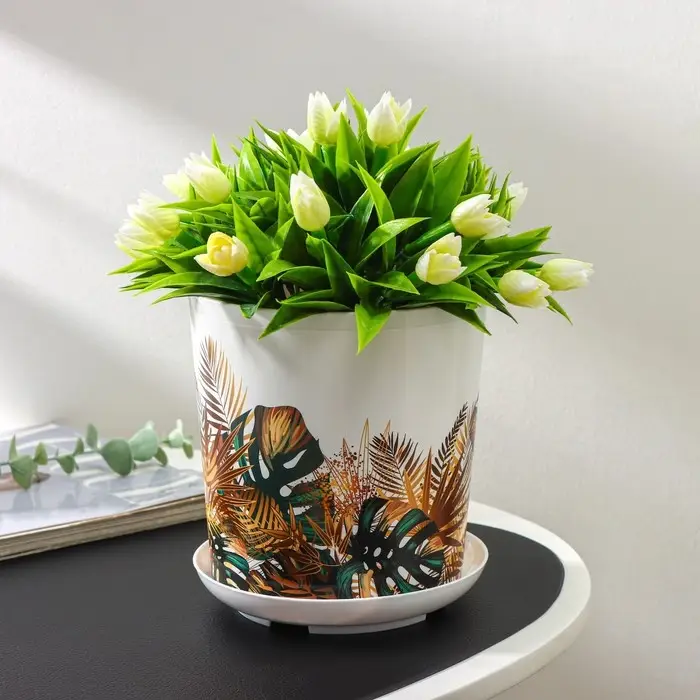 Горшок для цветов с поддоном Доляна «Голди. Листья», 1,6 л, d=14 см, h=15,5 см, пластиковый, цвет белый