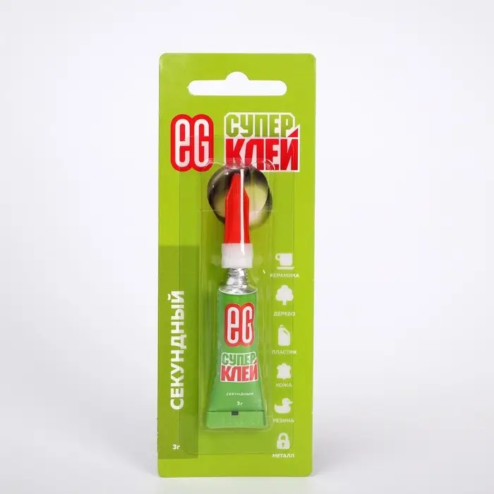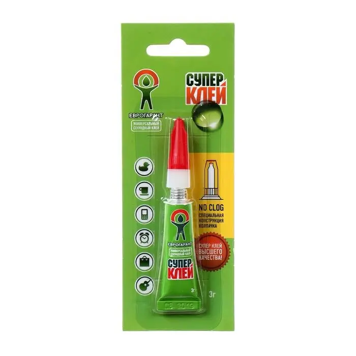 Универсальный секундный клей. Обеспечивает моментальное и качественное склеивание изделий из разных материалов (резины, дерева, пластмассы, керамики, металла, фарфора, картона). Не рекомендуется применять для склеивания изделий из полиэтилена и посуды, используемой для приема пищи.
