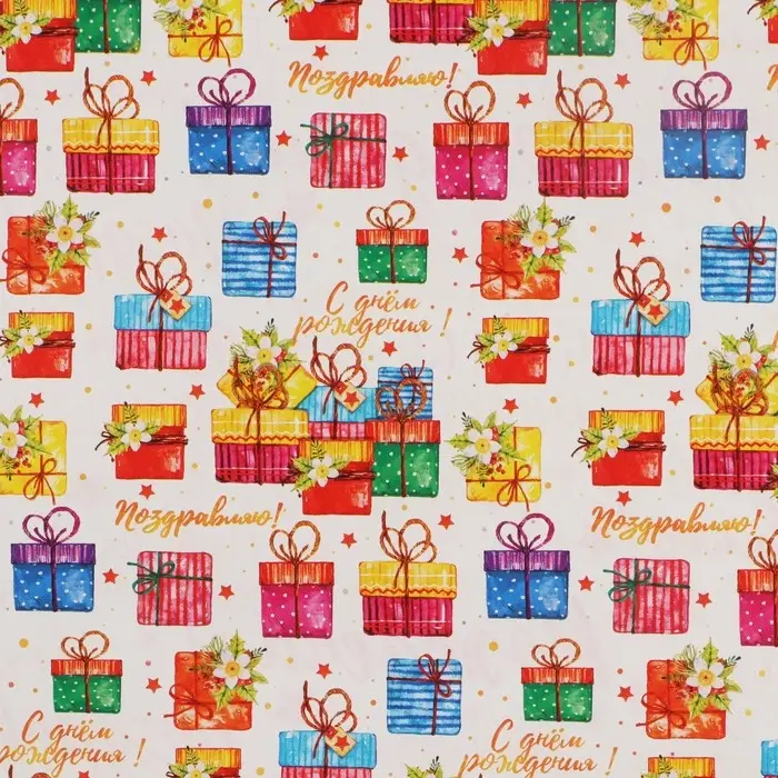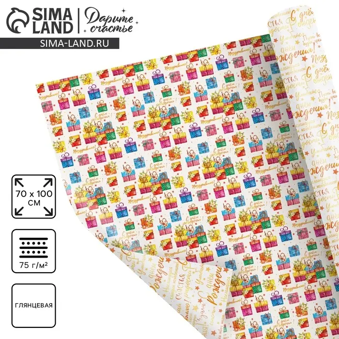 Бумага упаковочная глянцевая двухсторонняя «Подарки», 70 х 100 см