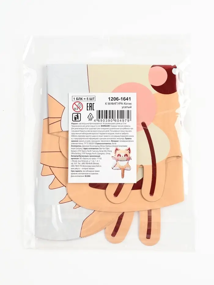 Воздушные шары фольгированные 15" «Котик», 5 шт., для палочки