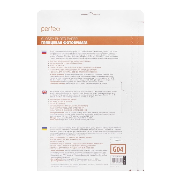 Носитель Perfeo PF-GLR4-230/50 имеет плотную белую поверхность, подходящую для переноса ярких и четких изображений. А глянцевое покрытие делает фотографии максимально привлекательными, попутно защищая их от быстрого выгорания на солнце. Данная бумага используется при печати на струйных принтерах при разрешении до 5760 dpi. Изделие поставляется в виде пачек по 50 листов.