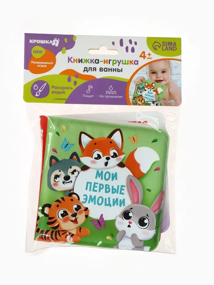 Развивающая книжка для купания «Мои первые эмоции» — яркая и мягкая игрушка с пищалкой, созданная специально для игр в ванной. Она подойдёт детям с 4 месяцев и превратит обычное купание в увлекательную развивающую активность.
