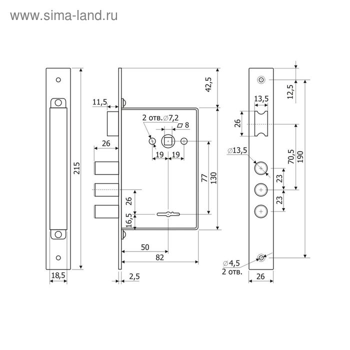 Врезной замок устанавливается в двери толщиной 30–75 мм. Модель обладает 3 цилиндрическими ригелями диаметром 13,5 мм с максимальным вылетом 26 мм.