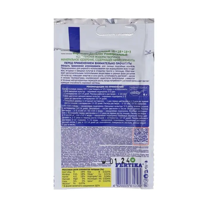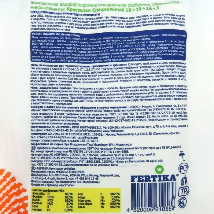 Fertika «Кристалон Универсальный» — это полностью водорастворимое комплексное азотно-фосфорно-калийное удобрение с микроэлементами. Оно предназначено для выращивания всех овощных и цветочных культур в открытом грунте и теплицах.
