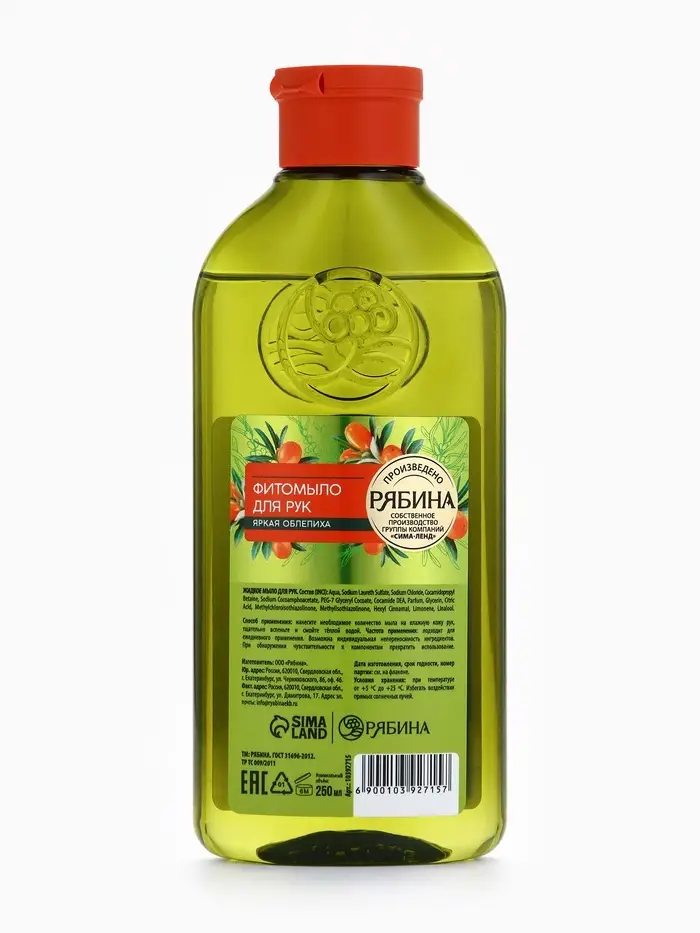 Мыло жидкое для рук, увлажнение и забота, аромат облепихи, 250 мл, Рябина