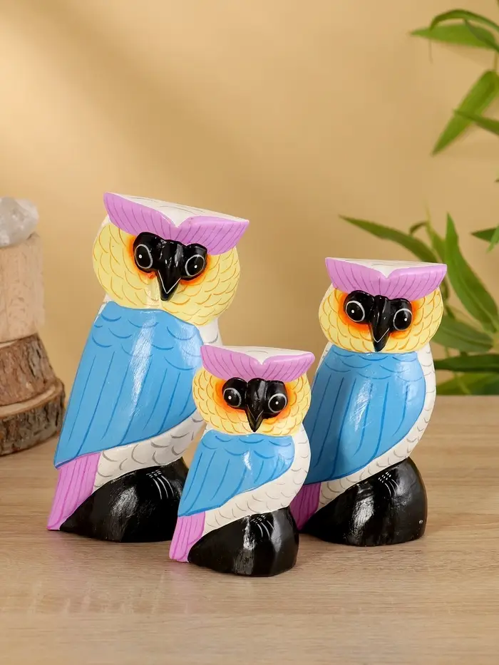 Набор сувенирный «Совы», h=18 см, h=14.5 см, h=11 см, дерево, бело-синий
