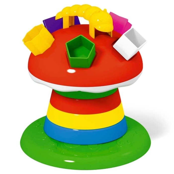 Логическая пирамидка-сортер «Гриб на поляне» — универсальная игрушка, которая объединяет в себе две функции. В основе она является обычной пирамидкой, но с шапочкой гриба, которая функционирует как сортер. На шапочке гриба удобно сидит гусеничка-ручка.