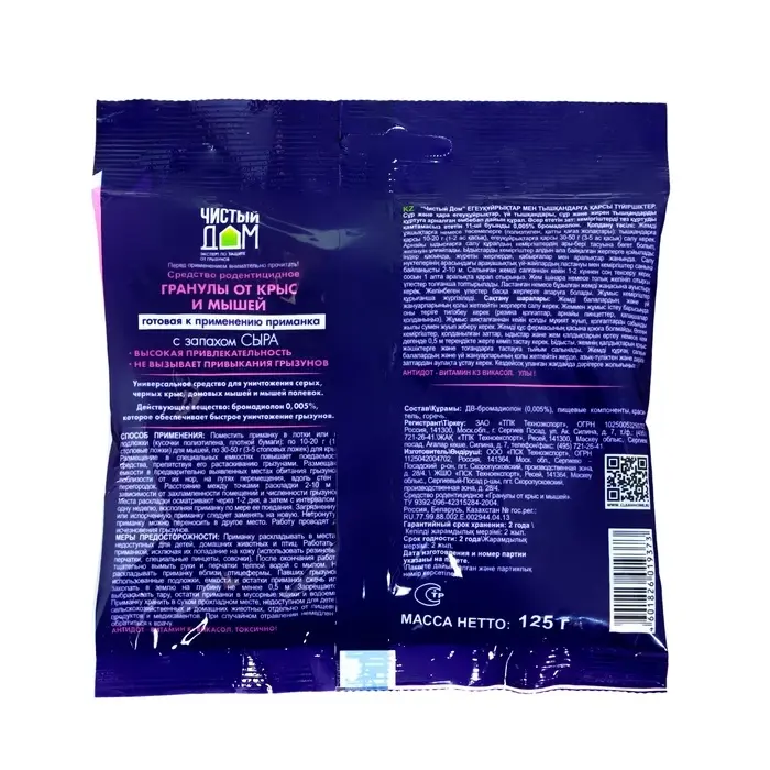 Гранулы от крыс и мышей "Чистый дом" с запахом сыра 125 г - это эффективное средство для борьбы с грызунами в домашних условиях. Гранулы имеют специальный аромат сыра, который привлекает крыс и мышей, что делает их более привлекательными для использования. Продукт предназначен для использования внутри помещений и обладает высокой степенью безопасности для людей и домашних животных.