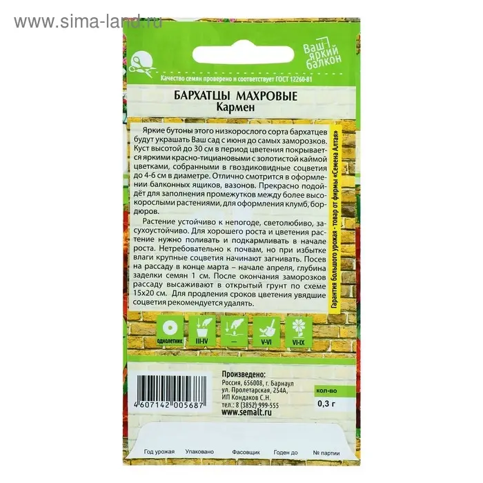 Семена цветов Бархатцы "Тайшан", смесь, Сем. Алт, ц/п, 5 шт Семена цветов Бархатцы "Тайшан", смесь, Сем. Алт, ц/п, 5 шт