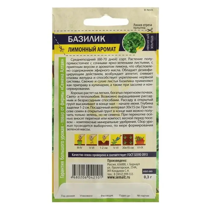 Среднепоздний (60-70 дней) сорт. Растение полупрямостоячее с сочными ярко-зелеными листьями, с приятным вкусом и ароматом лимона, что обусловлено содержанием эфирного масла. Обладает дезинфицирующим действием, возбуждает аппетит, снимает спазмы желудка и способствует укреплению нервной системы. Свежие и сухие листья базилика применяют как приправу в кулинарии, а также при засолке и консервировании. Хорошо растет на легких, богатых перегноем почвах. Свето- и теплолюбив. Возможно выращивание рассадным и безрассадным способами. Рассаду в открытый грунт высаживают в конце мая — начале июня. Глубина заделки 1-2 см. Посадочный интервал 30х15 см. При посеве семян в открытый грунт в конце мая можно получить только зелень, но не семена. При перекопке осенью вносят перегной или компост, весной перед посевом — комплексные минеральные удобрения. Сбор урожая проводится выборочно, по мере формирования зеленой массы.