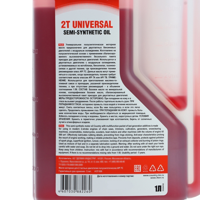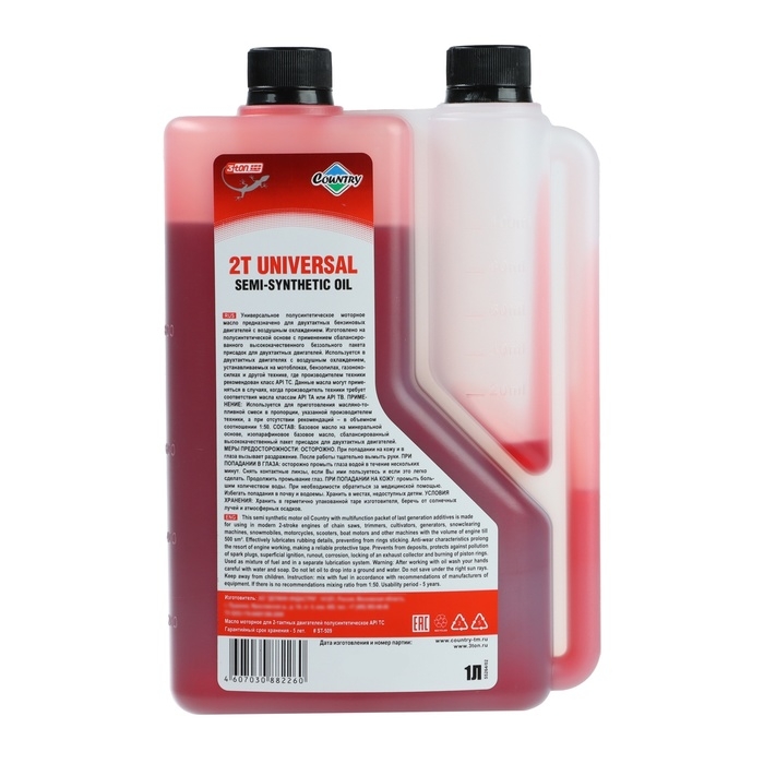 Масло двухтактное полусинтетическое Country API ТС - это высококачественное масло для двухтактных двигателей, которое обеспечивает надежную защиту и смазку деталей двигателя. Оно подходит для использования в садовой технике, мотоциклах, снегоходах и других транспортных средствах с двухтактными двигателями. Масло легко смешивается с бензином в пропорции 1:50 и обладает высокой термической стабильностью, что гарантирует сохранение его свойств даже при высоких нагрузках. Оно также обладает хорошими моющими свойствами и предотвращает образование нагара на деталях двигателя. Масло поставляется в удобной упаковке с дозатором, что облегчает его использование.