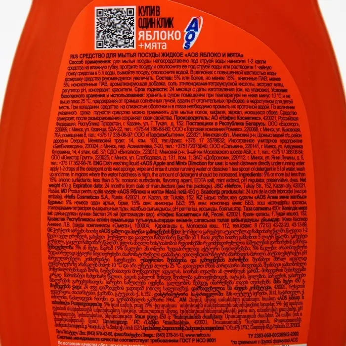 Средство для мытья посуды AOS "Яблоко + мята" 450 мл