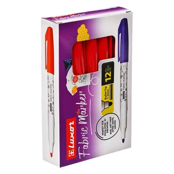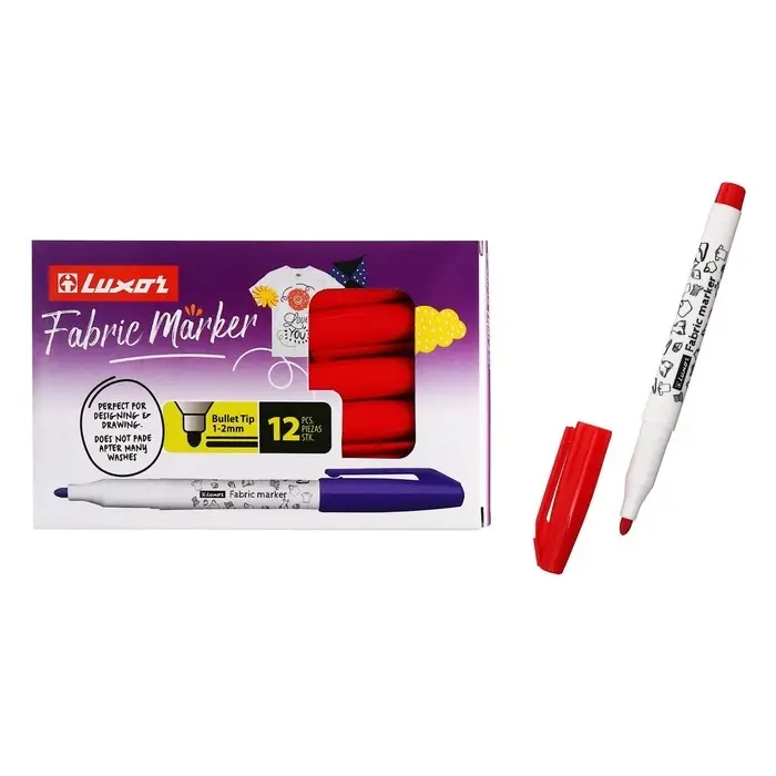Маркеры для ткани Luxor "Fabric", подходят для различных видов тканей: от хлопковых сумок и футболок, до интерьерных тканей. Идеальны для дизайнеров по текстилю. Цвета автоматически закрепляются через 24 часа, или после глажки. Не смазываются при стирке 40°C (в зависимости от типа ткани и содержания натуральных волокон). Ручная стирка должна быть более бережной. Маркер имеет круглую форму корпуса и водостойкие пигментированные чернила на водной основе. Не токсичны. Не выцветают после многих стирок. Пишущий узел-1-2 мм. Цвет чернил- красный. Упаковка: картонная коробка по 12 штук