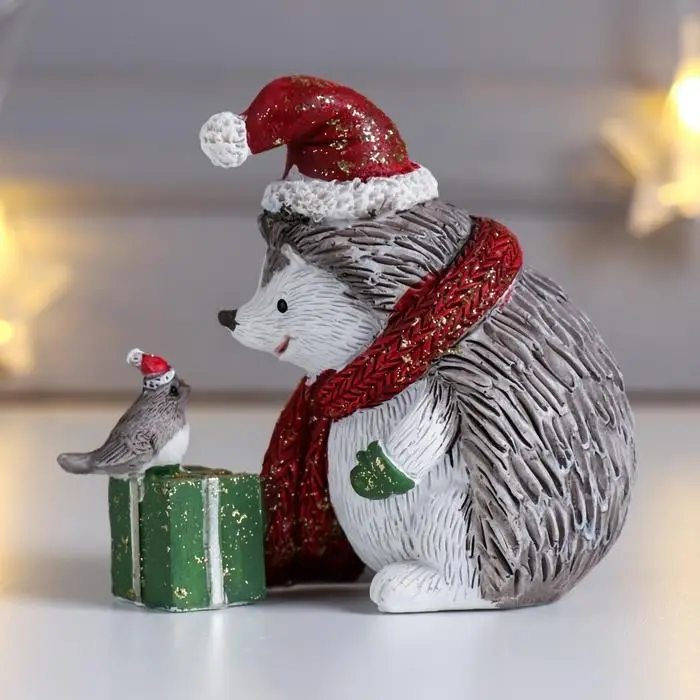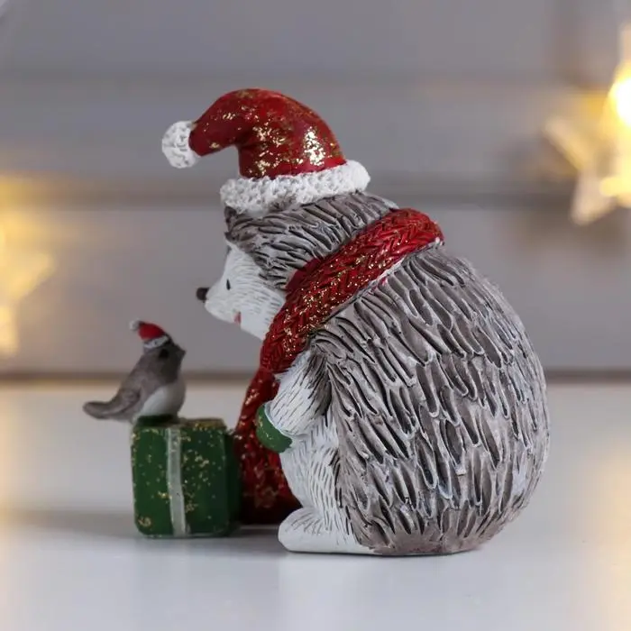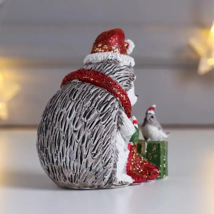 Сувенир полистоун "Ёжик в красном колпак и шарфе, с подарком и птичкой" беж 8,5х5х9,5 см