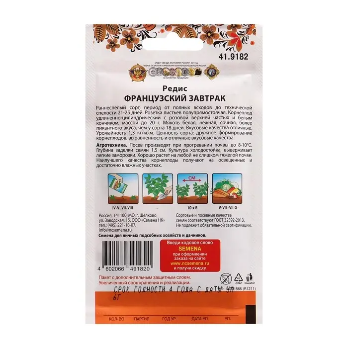 Раннеспелый (21-24 дня от всходов до технической спелости) сорт. Корнеплод удлиненный, с белым кончиком, массой до 20 г, диаметром 2-3 см. Мякоть белая, сочная, без горечи. Корнеплод полностью погружен в почву. Сорт устойчив к стеблеванию. Рекомендуется для выращивания в открытом грунте, весенних теплицах, пленочных укрытиях. Посев в грунт производится в конце апреля-начале мая, июле на глубину 1 см по схеме 5-7х15 см. Урожайность 2,0-2,3 кг/м2.