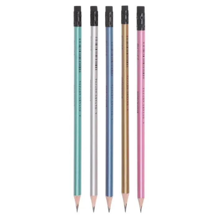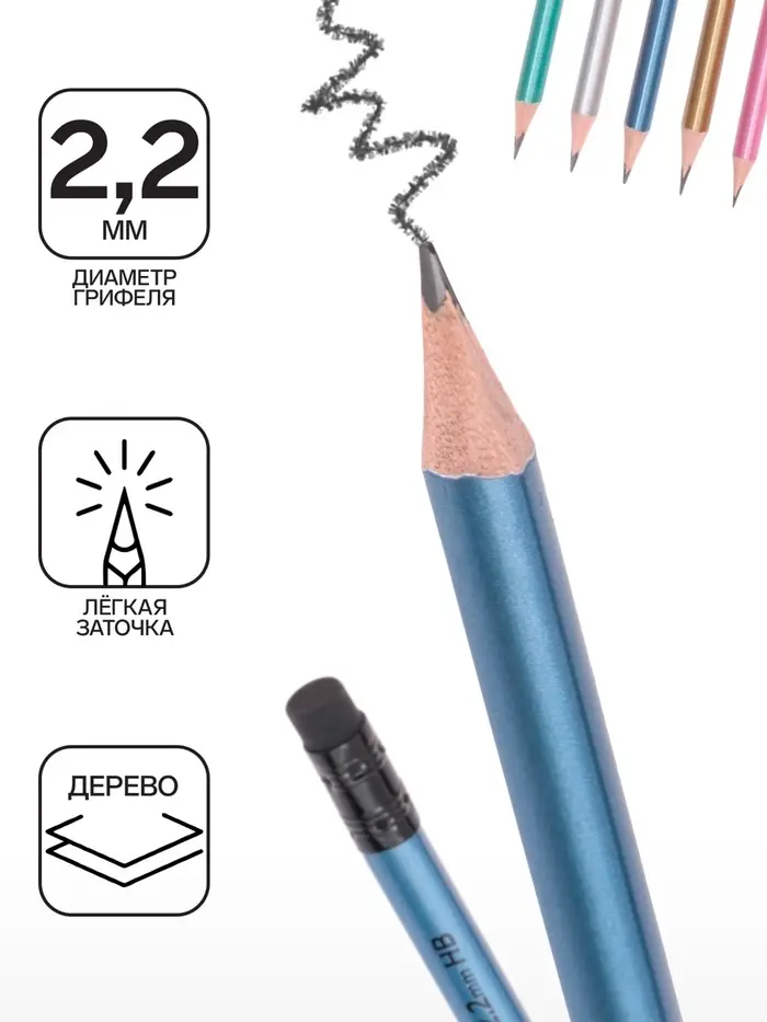 Эргономичный трехгранный чернографитный карандаш из отборной древесины с ластиком, твердость НВ. Шесть металлик цветов корпуса, черный ластик. Специальная пропитка древесины и сплошная проклейка грифеля обеспечивает высокую ударопрочность. Мягкая древесина и идеальная центровка грифеля гарантируют легкую заточку с экономным расходом карандаша. Грифель диаметром 2.2 мм не царапает бумагу и не крошится. Ластик карандаша средней жесткости изготовлен из экологически чистого и гипоаллергенного материала термопластичной резины (TPR). Не содержит ПВХ. Длина 188 мм.