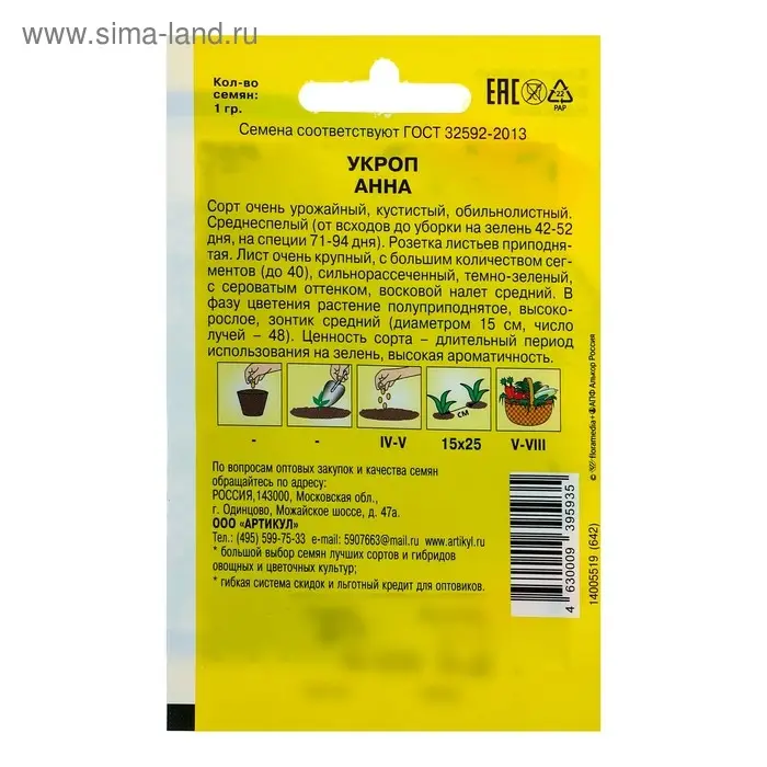 Семена Укроп "Анна" кустовой, среднеспелый, 1 г