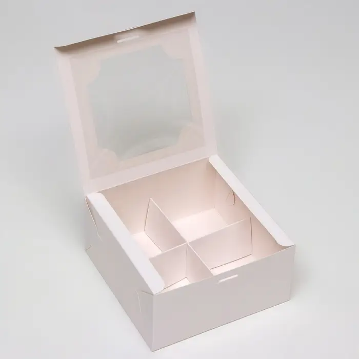 Внутреннее пространство разделено на четыре ячейки, что позволяет удобно разместить каждое пирожное или капкейк отдельно.