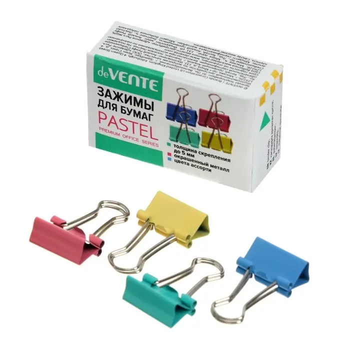 Зажим для бумаг deVENTE. Pastel металлический (15 мм) толщина скрепления до 5 мм, цветной ассорти, 12 штуки в картонной коробке