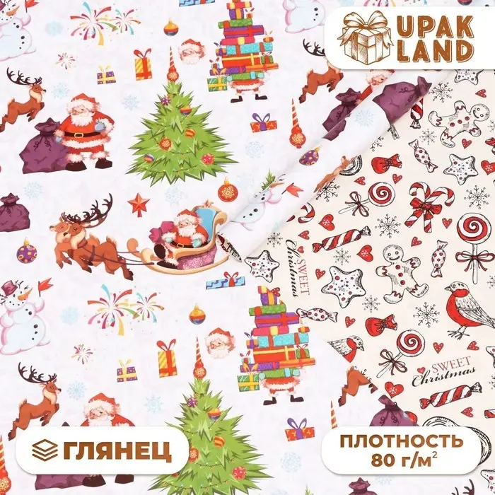 Бумага упаковочная глянцевая «Рождество», двусторонняя, 70×100 см