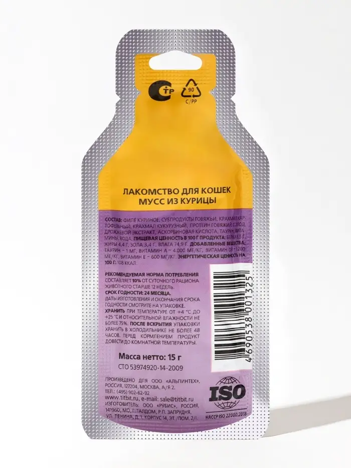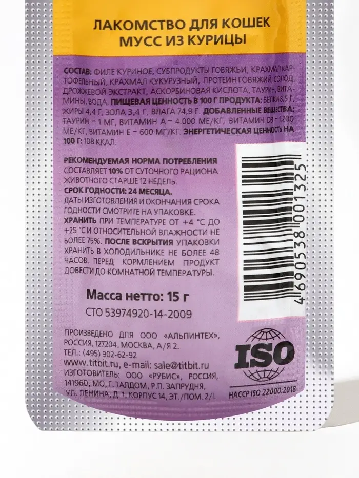 Мусс из курицы лакомство для кошек TitBit 15 г