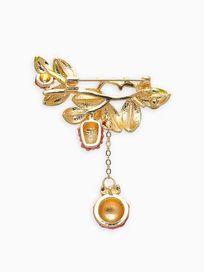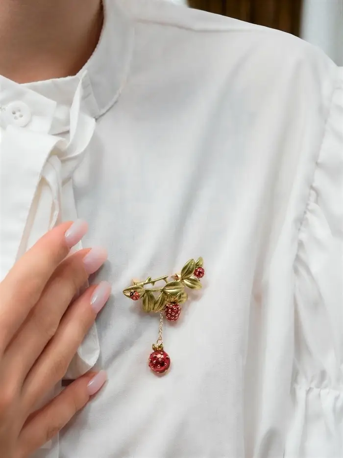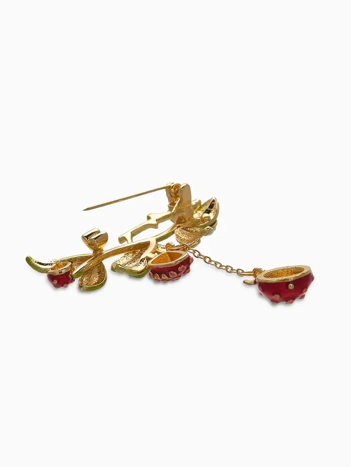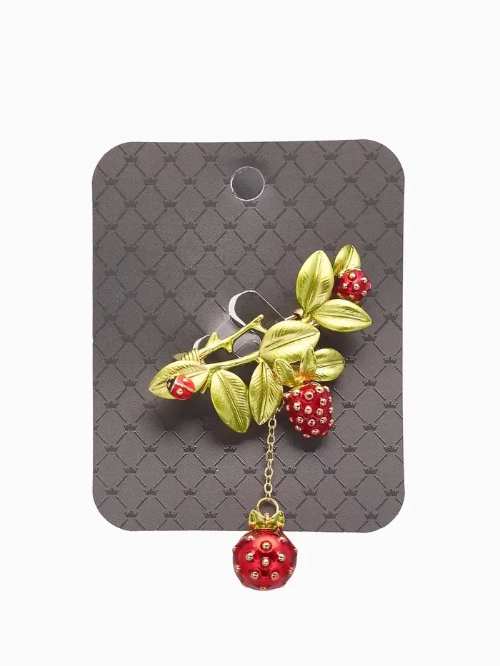 Брошь "Малина" с божьей коровкой, зелёно-красная в золоте