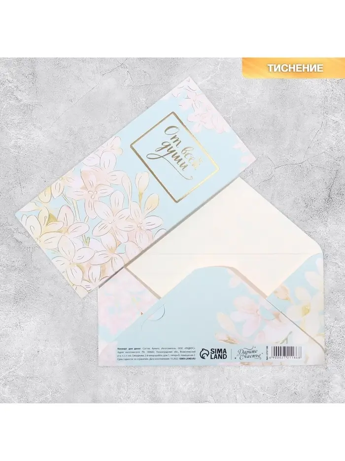 Конверт для денег «От всей души» тиснение, 16.5×8 см
