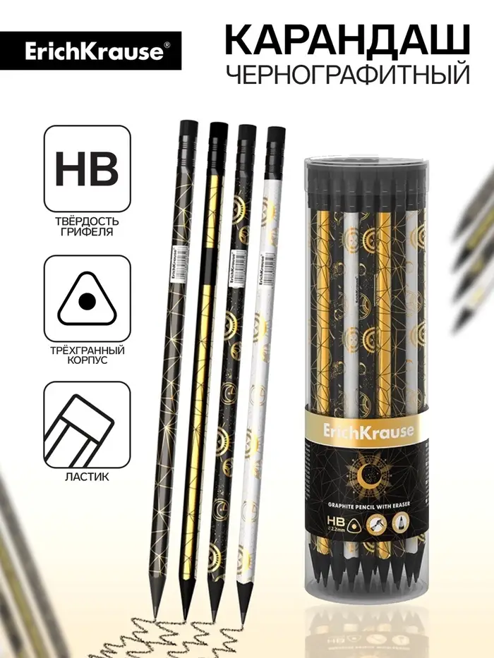 Эргономичный трехгранный чернографитный карандаш с ластиком из отборной древесины, твердость НВ.