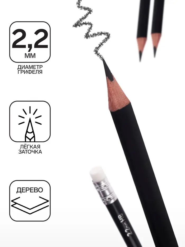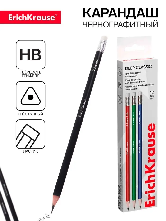 Классический трехгранный чернографитный карандаш из отборной древесины с ластиком, твердость НВ. Специальная пропитка древесины и сплошная проклейка грифеля обеспечивает высокую ударопрочность. Мягкая древесина и идеальная центровка грифеля гарантируют легкую заточку с экономным расходом карандаша. Грифель диаметром 2.2 мм не царапает бумагу и не крошится. Ластик карандаша средней жесткости изготовлен из экологически чистого и гипоаллергенного материала термопластичной резины (TPR). Не содержит ПВХ. Длина 188 мм.
