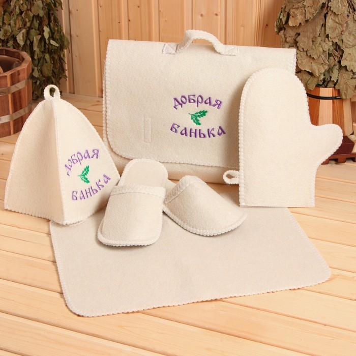 Для комфортного отдыха в парной возьмите с собой набор банных принадлежностей. Предметы из этого комплекта предохраняют тело от перегрева и являются средствами индивидуального пользования. Влажные изделия рекомендуется сушить в расправленном виде на горизонтальной поверхности. Принадлежности из войлока и фетра стирайте вручную при температуре воды 30 °C.