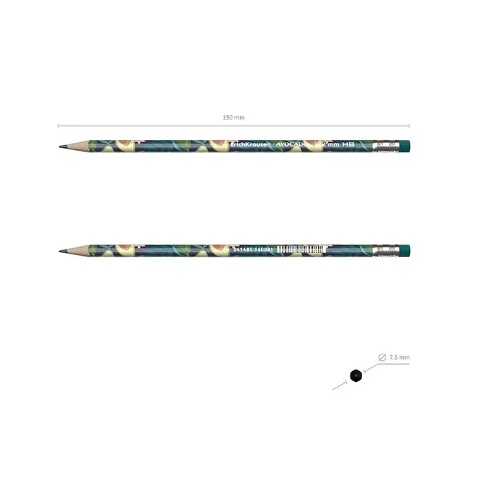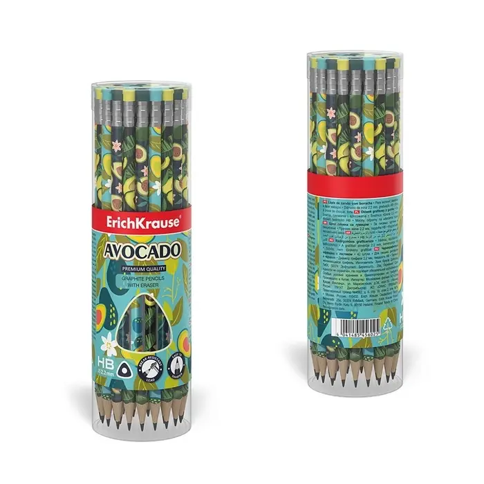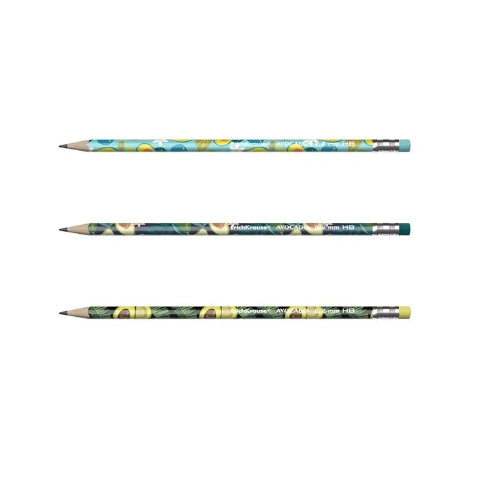 Карандаш чернографитный с ластиком ErichKrause "Avocado", HB, грифель d=2.2 мм, дерево, трeхгранный с принтом, в тубусе, микс
