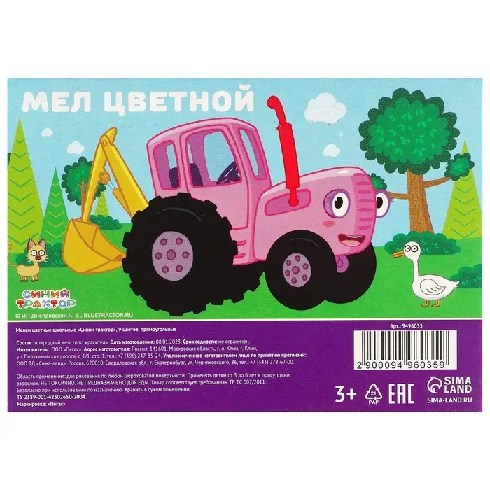 Мелки цветные школьные, набор 9 шт. «Синий трактор», прямоугольные