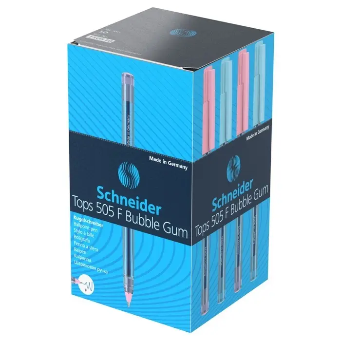 Письменные принадлежности Schneider разрабатываются и производятся только в Германии, их отличают функциональный дизайн, безупречное качество, надежность и экологичность. Одноразовая шариковая ручка ”Tops 505 F” с вентилируемым колпачком пишет в 2 раза дольше других хороших ручек. “Tops 505 F Bubble Gum” обеспечит ровное и гладкое письмо, а полупрозрачный дизайн корпуса в розовых и голубых оттенках подчеркнет ваш стиль и индивидуальность. Длина непрерывной линии - до 4 000 метров.