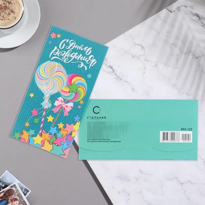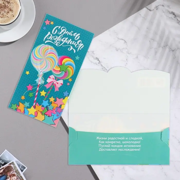Конверт для денег "С Днём Рождения!" бирюзовый фон, 8,7х17 см