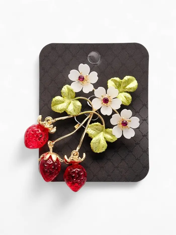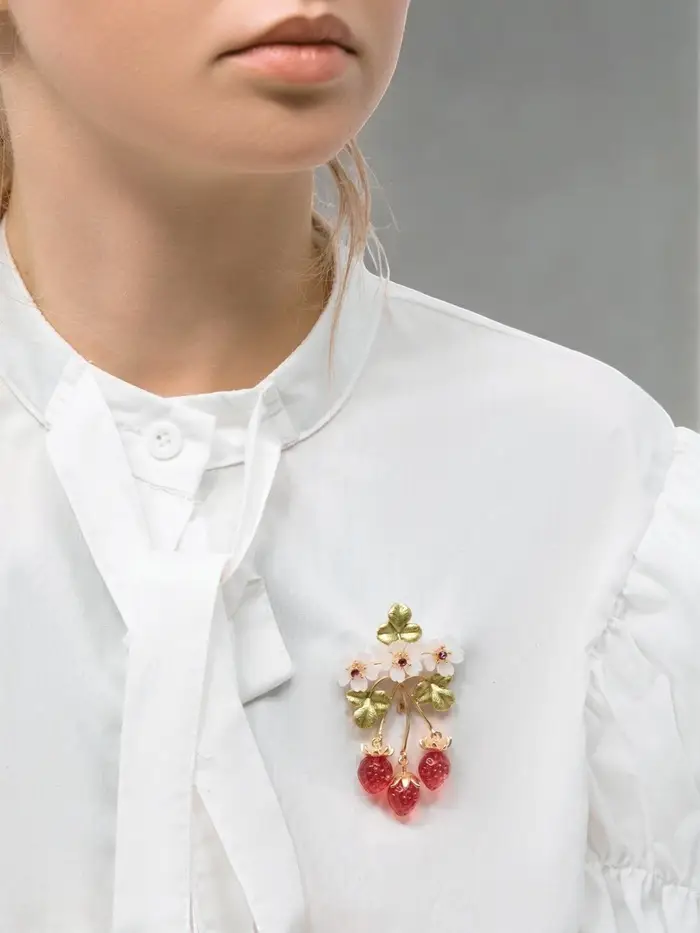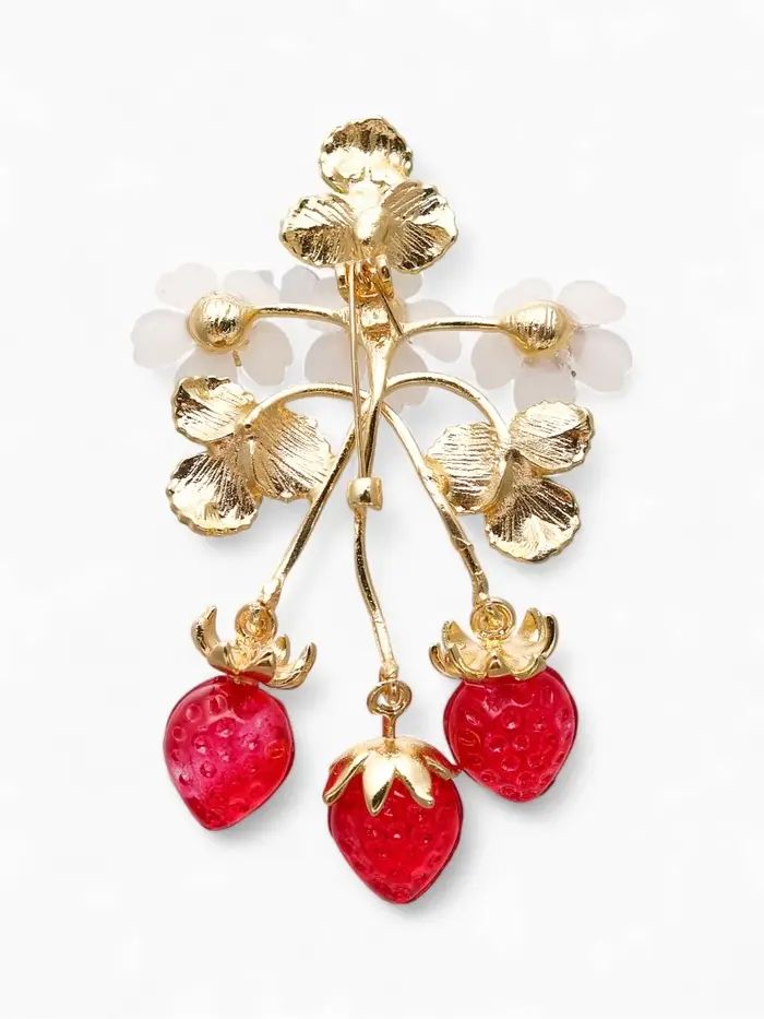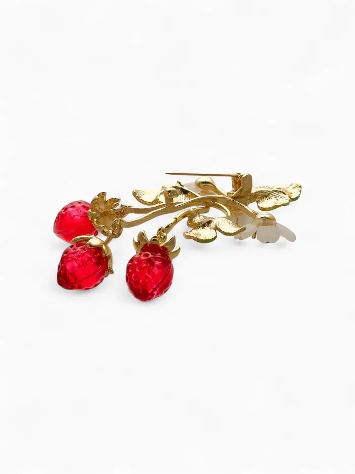 Брошь "Земляника" с цветочками, цветная в золоте