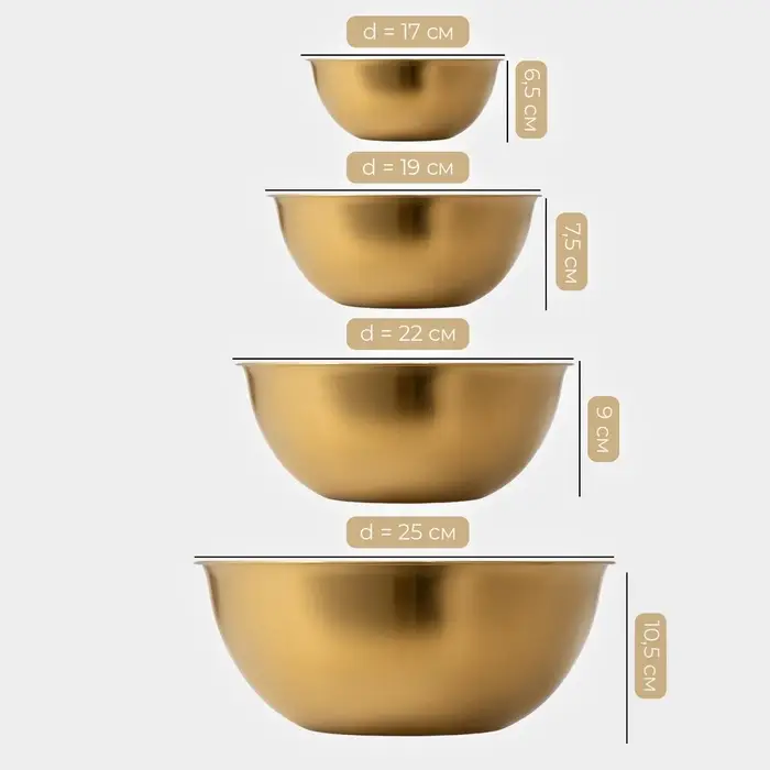 Миски-салатники Sphere, 950 мл, 1,55 л, 2,4 л, 3,4, с мерной шкалой, нержавеющая сталь, набор 4 шт, золотые