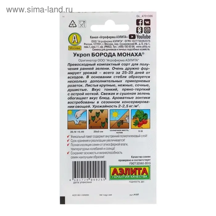 «Борода монаха» — это раннеспелый сорт укропа, у которого товарная урожайность зелени составляет 2–2,5 кг/м², а специй — 4,5 кг/м². Подходит для употребления в свежем виде, сушения и замораживания.