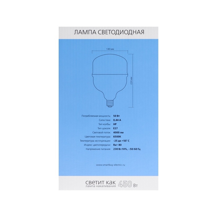 Лампа cветодиодная Smartbuy, E27, 50 Вт, 6500 К, холодный белый, переходник на Е40