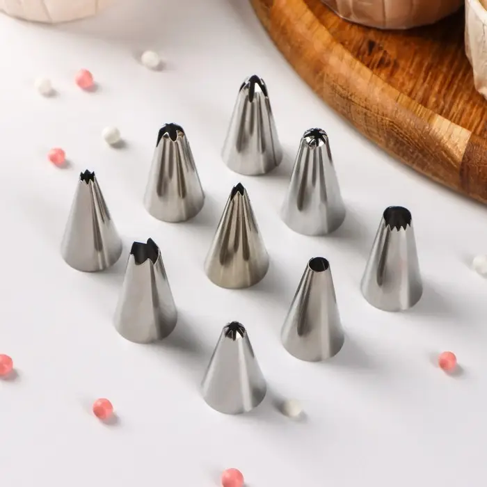 - Кондитерские насадки выполнены из пищевой нержавеющей стали, что гарантирует безопасное и долговечное использование.